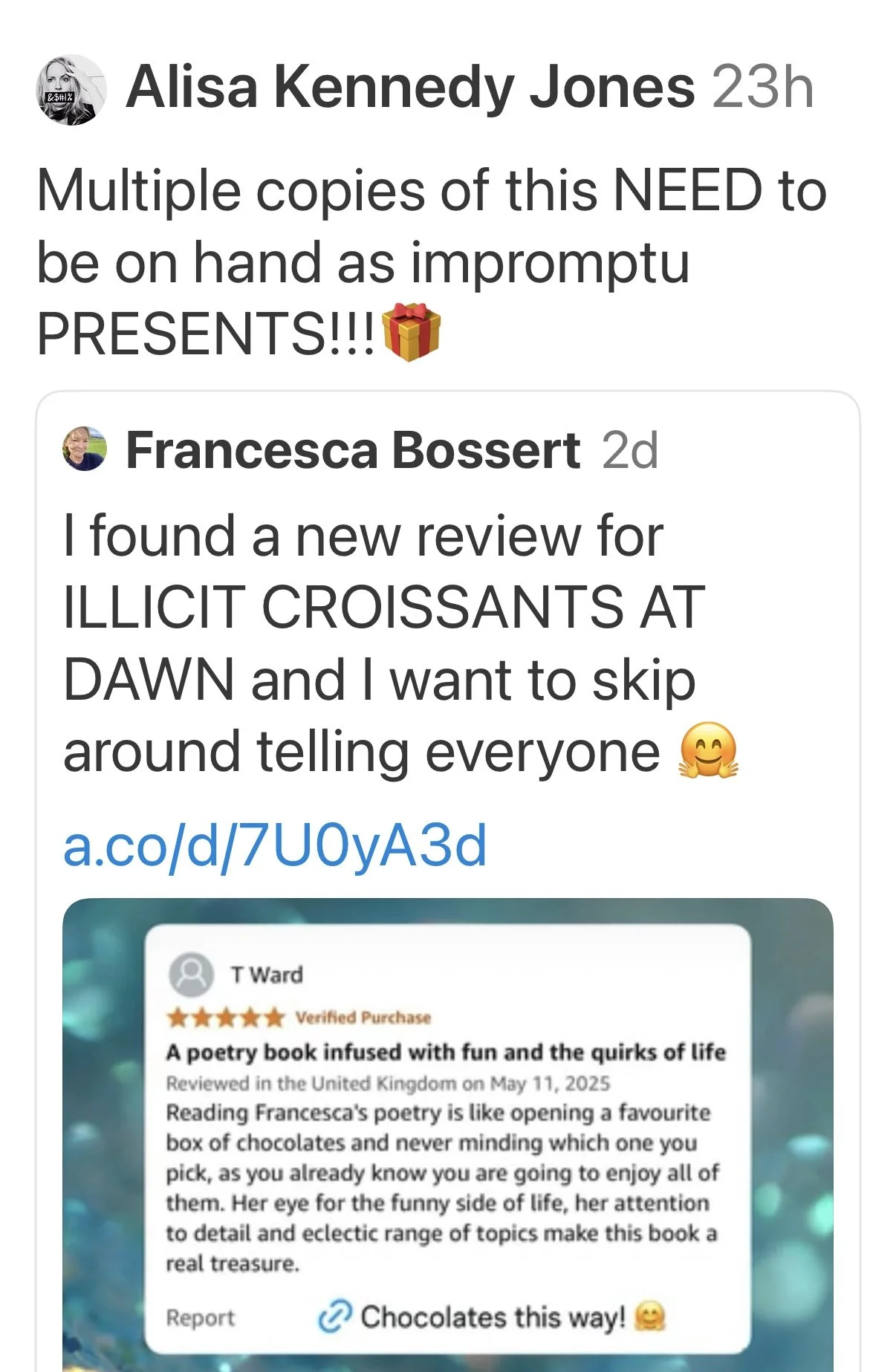 On a happier note, Alisa is right, my poetry book, Illicit Croissants at Dawn, does make a lovely present, especially the hardback version.